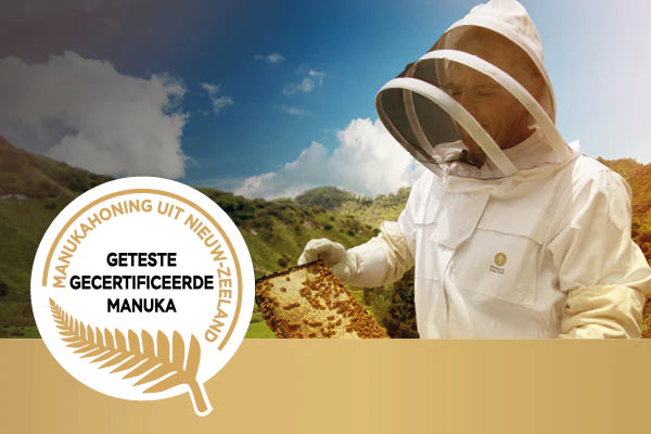 DOOR DE NIEUW-ZEELANDSE OVERHEID GECERTIFICEERD ALS OORSPRONKELIJKE MANUKA HONING. IEDERE POT IS IN NIEUW-ZEELAND VERPAKT.