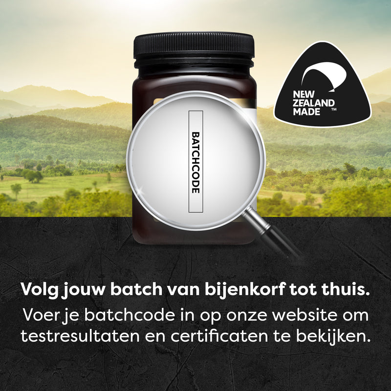 100% Manuka Honing uit Nieuw-Zeeland. Gecertificeerd door de Nieuw-Zeelandse overheid.